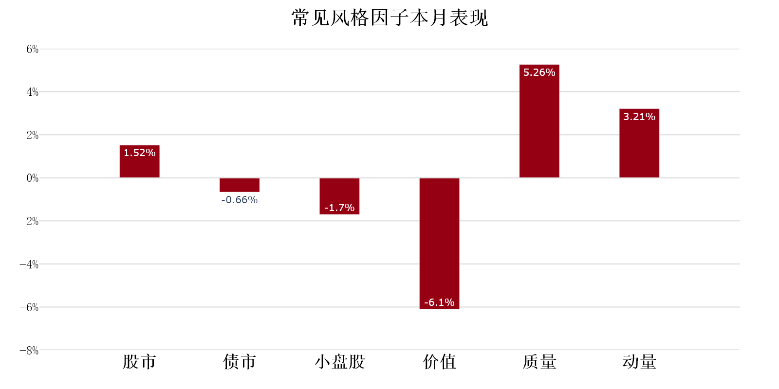 2025年9月,A股市场上涨,债券市场下跌;常见的风格因子中,质量风格表现出众,动量风格表现较好,价值风格持续回撤: