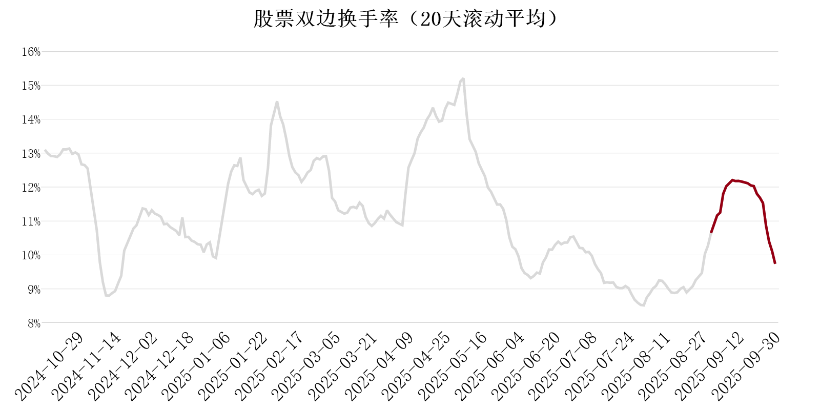 在同等规模下,投资组合所承担的实际交易成本和股票双边换手率呈正相关。本月所有产品平均的股票双边换手率先上升后下降: