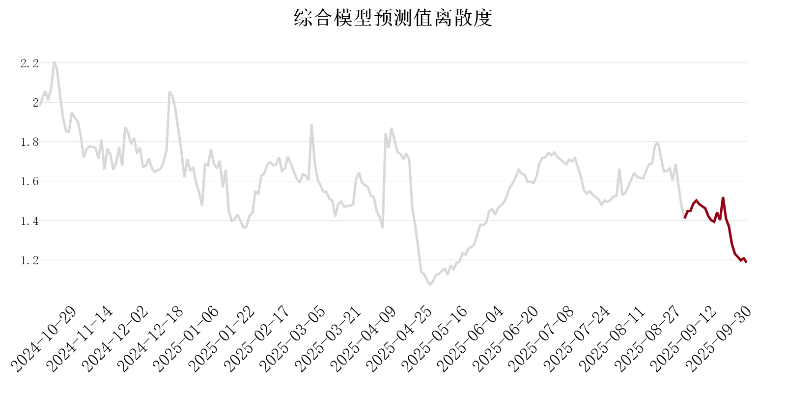 磐松的股票回报预测模型分为行业和个股两个层面,而综合模型结合了个股模型和行业模型。综合模型预测值的离散度反映了当前的投资机会,预测值的离散度越高,模型蕴含的投资机会越丰富。本月综合模型预测值离散度有所下降: