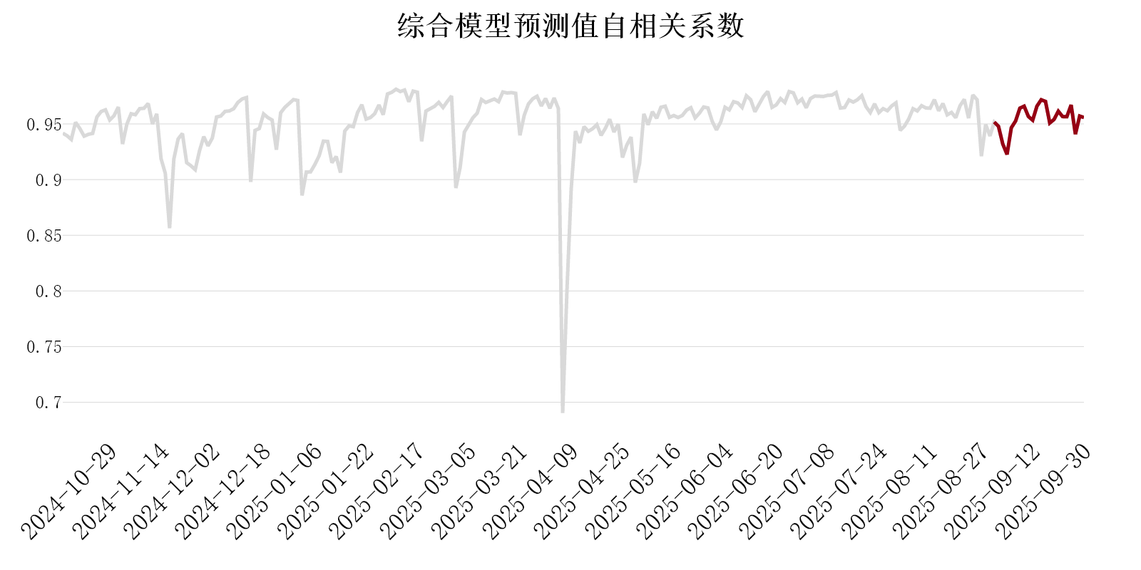 综合模型预测值的自相关系数(日频)体现了模型预测值的连续性。一般情况下,预测值的自相关系数越高,投资组合的换手率越低。本月综合模型预测值自相关系数在正常范围内波动: