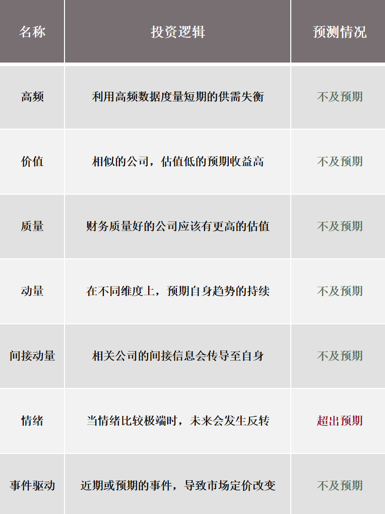 在个股信号组层面,本月情绪信号组表现超出预期,其余信号组表现均不及预期: