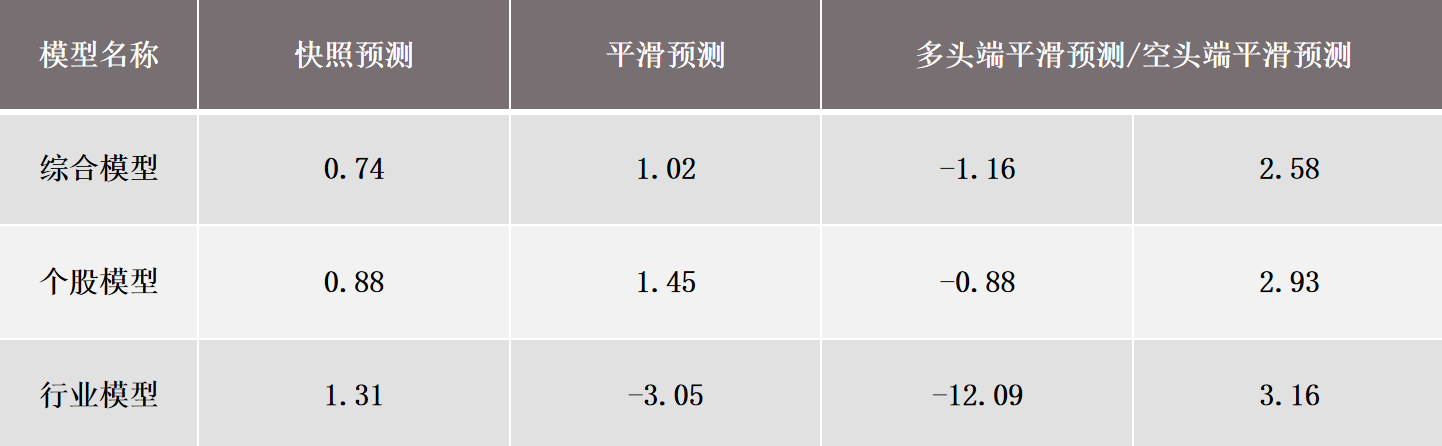 从平滑预测视角看,个股模型的表现超出预期,综合模型的表现符合预期,行业模型的表现显著差于预期。